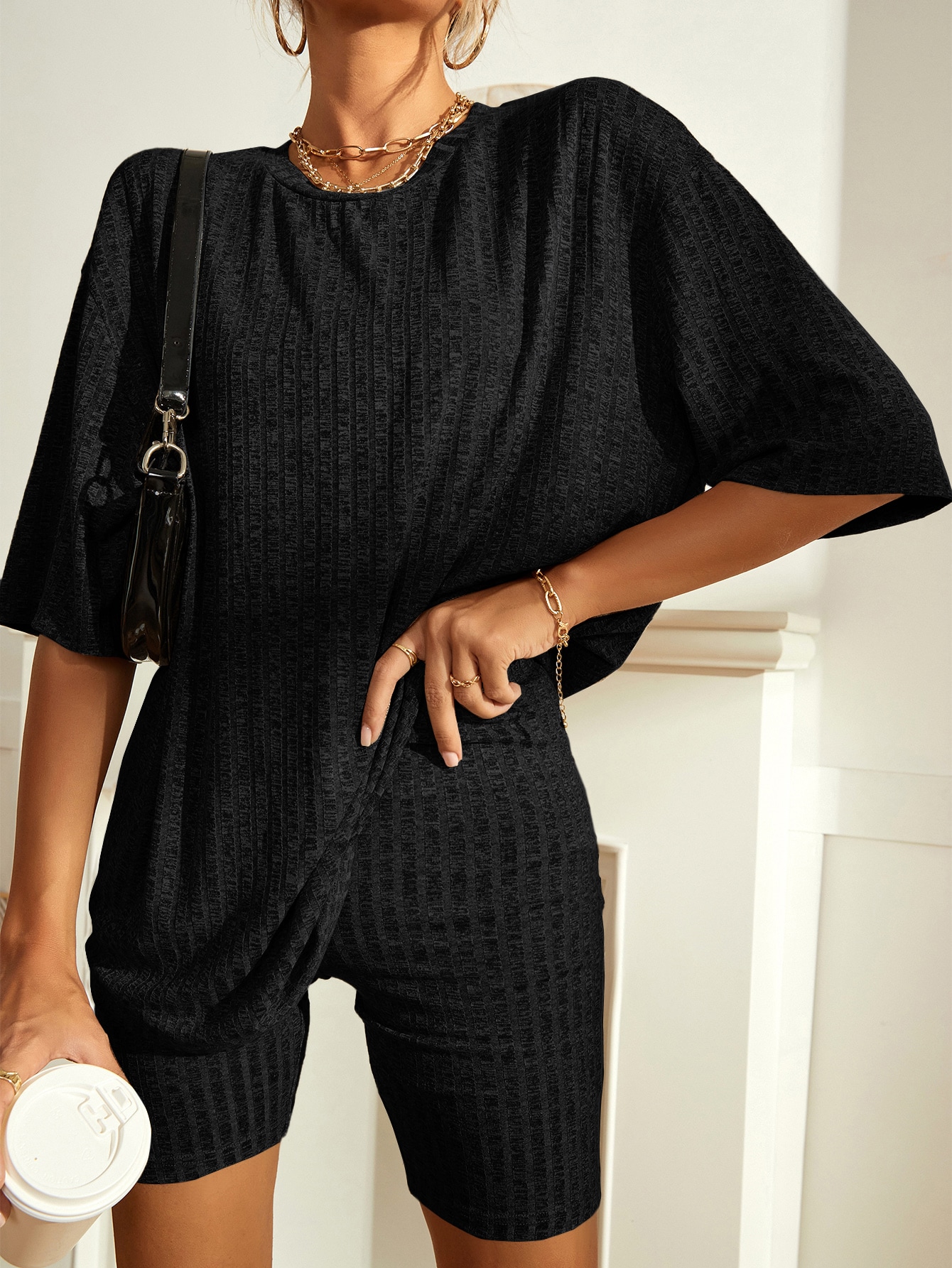 WDIRARA Women’s 2 Piece Outfits Ribbed Short Sleeve Drop Shoulder Tee and Shorts Set Tracksuits Black