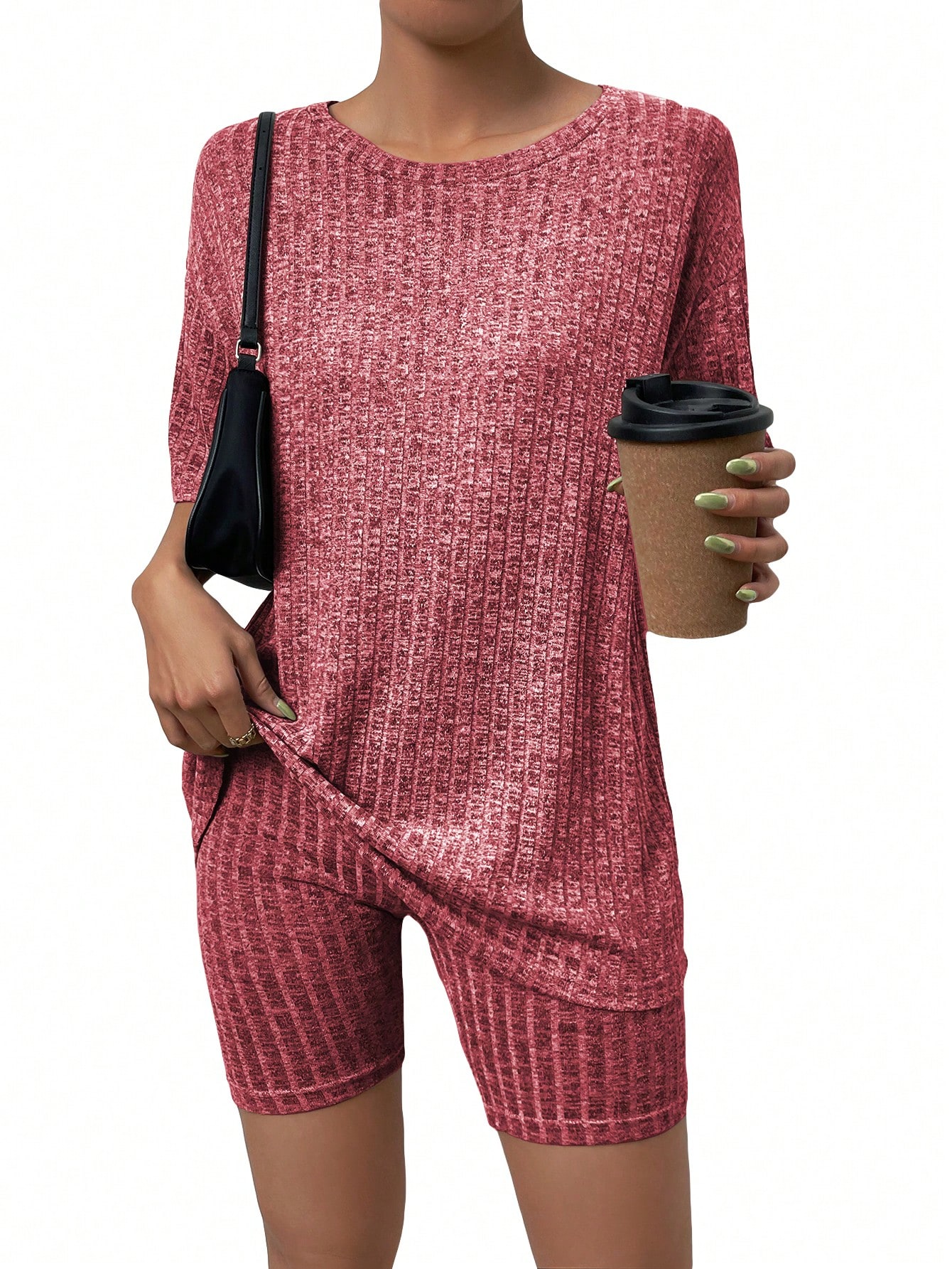 WDIRARA Women’s 2 Piece Outfits Ribbed Short Sleeve Drop Shoulder Tee and Shorts Set Tracksuits Rose Red