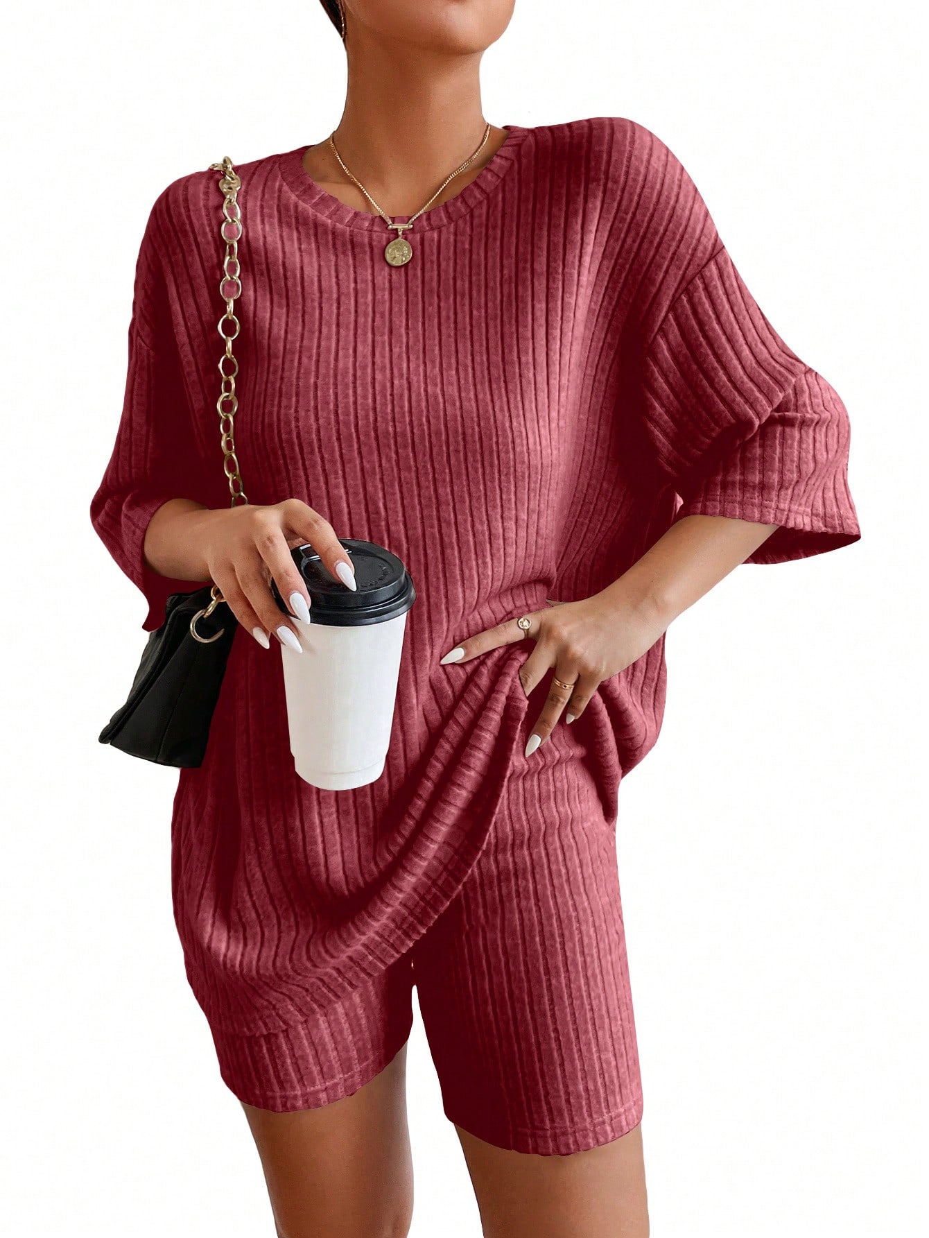 WDIRARA Women’s 2 Piece Outfits Ribbed Short Sleeve Drop Shoulder Tee and Shorts Set Tracksuits Burgundy
