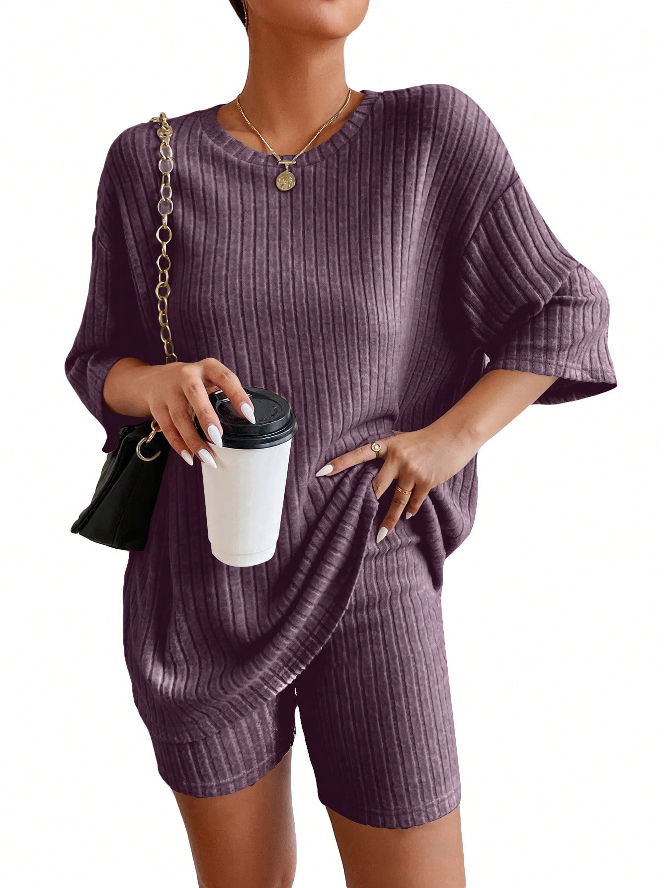 WDIRARA Women’s 2 Piece Outfits Ribbed Short Sleeve Drop Shoulder Tee and Shorts Set Tracksuits Purple