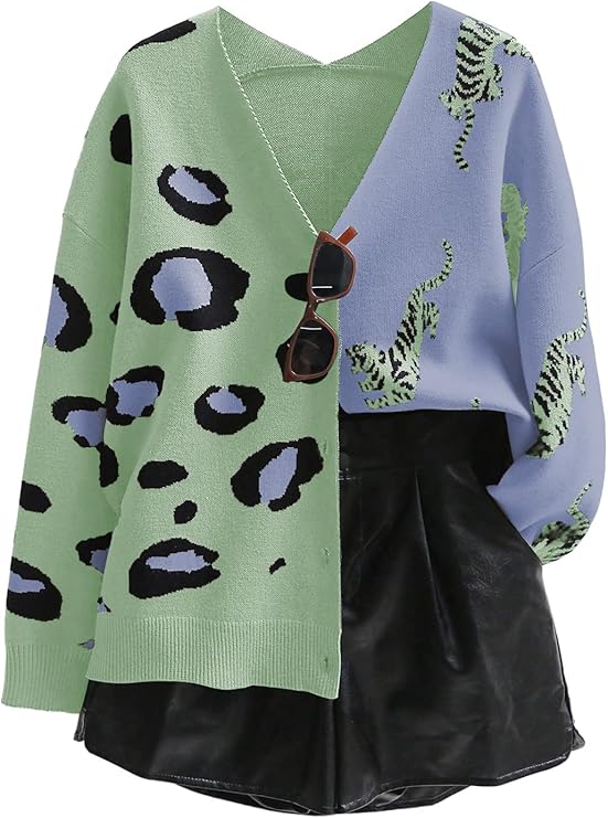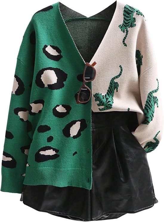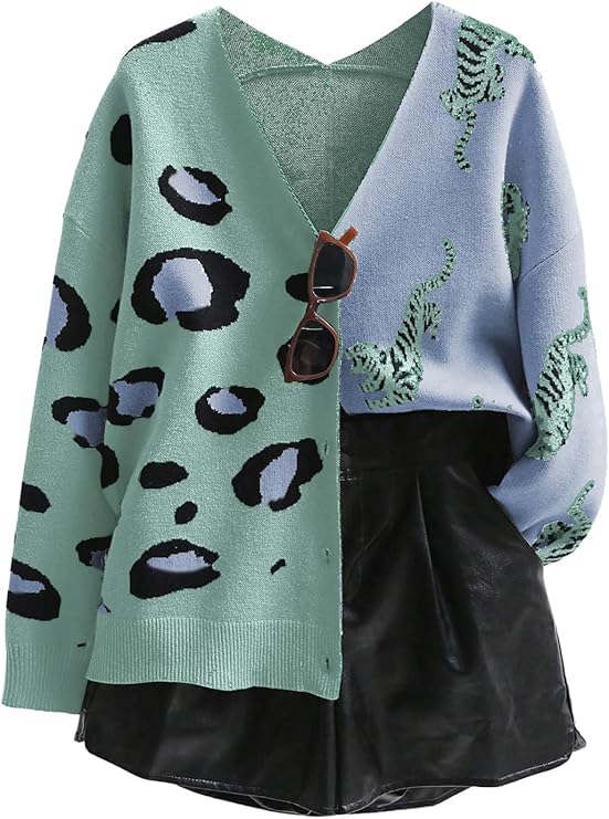 WDIRARA Women’s Leopard Tiger Print Cardigan V Neck Long Sleeve Color Block Button Down Sweater Outwear Green Multicolor