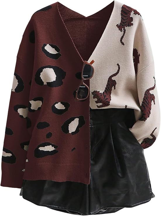WDIRARA Women’s Leopard Tiger Print Cardigan V Neck Long Sleeve Color Block Button Down Sweater Outwear Green Coffee Brown