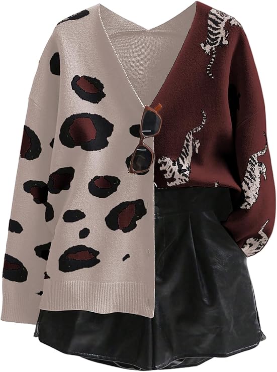WDIRARA Women’s Leopard Tiger Print Cardigan V Neck Long Sleeve Color Block Button Down Sweater Outwear Dark Brown and Apricot