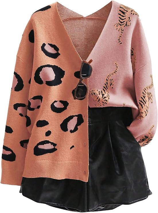 WDIRARA Women’s Leopard Tiger Print Cardigan V Neck Long Sleeve Color Block Button Down Sweater Outwear Pink and Brown