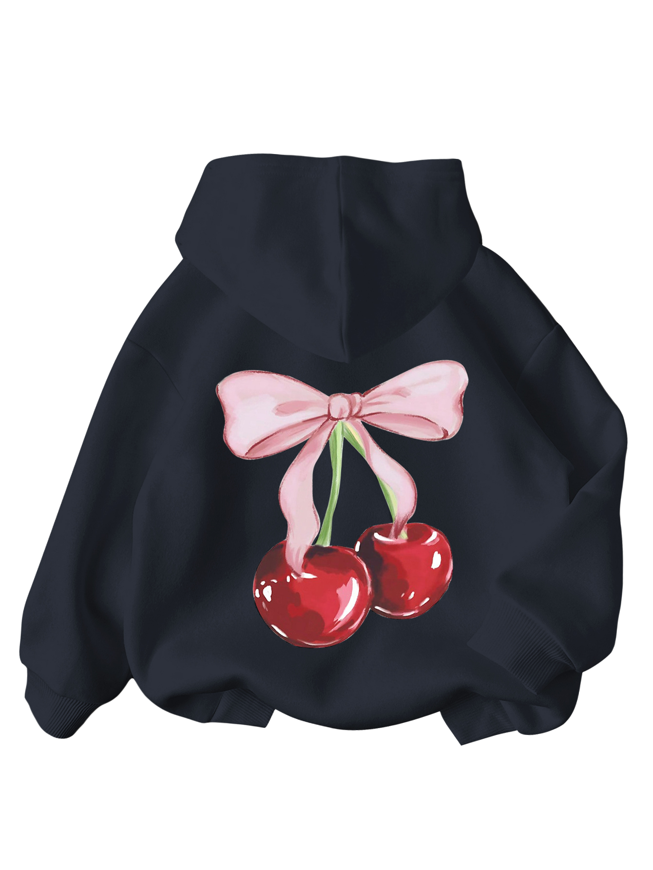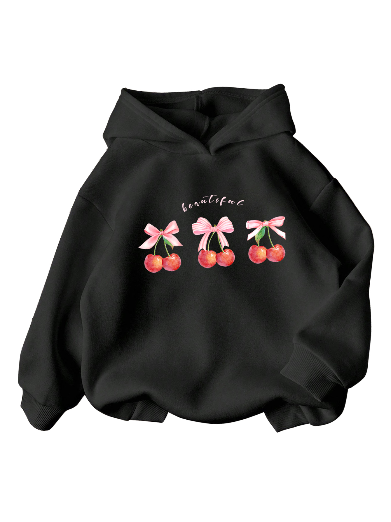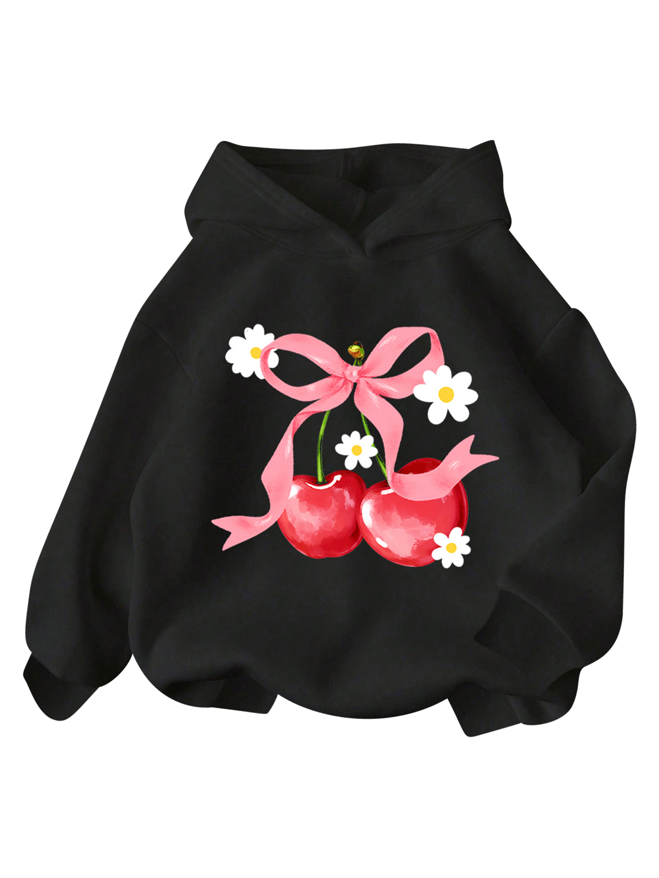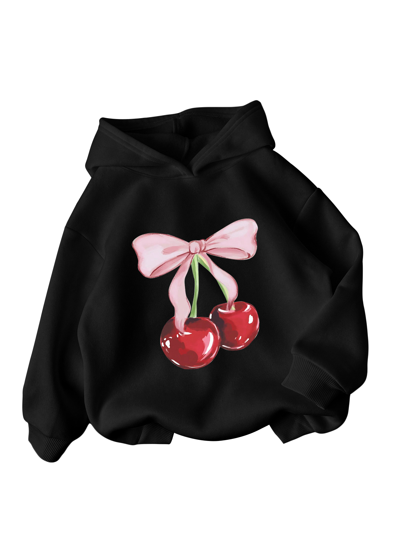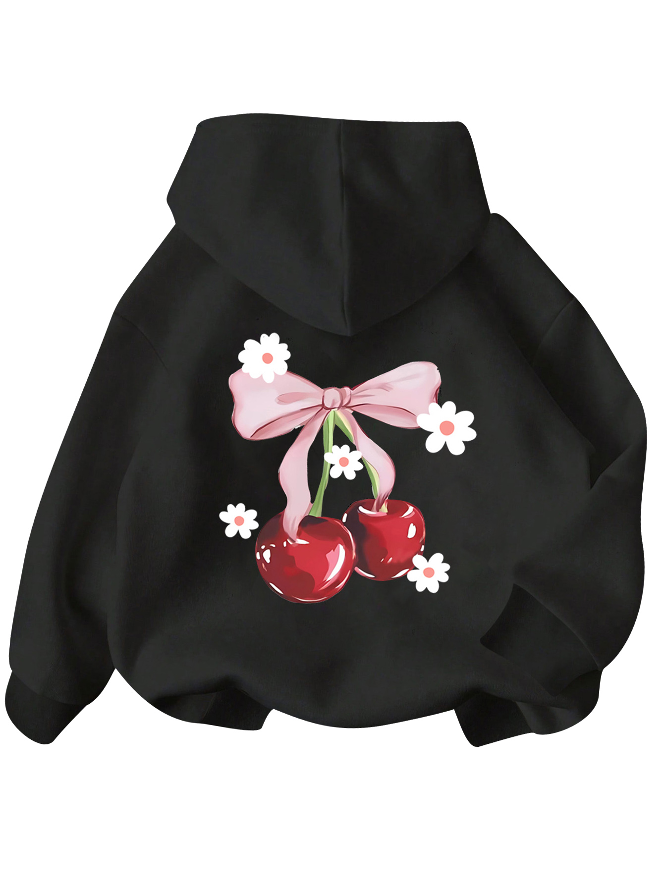 WDIRARA Girl’s Cherry Graphic Hoodie Long Sleeve Hooded Sweatshirt Cute Pullovers Tops Black Front Bow