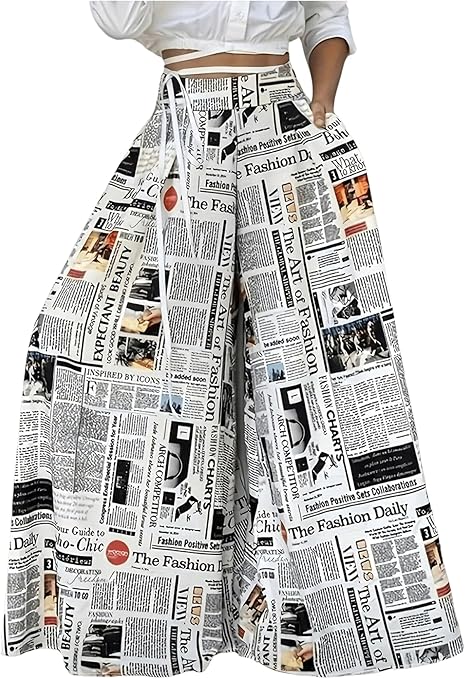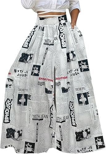 • WDIRARA Women’s Newspaper Print Wide Leg Pants Elastic Waist Loose Funky Letter Print Palazzo Pants