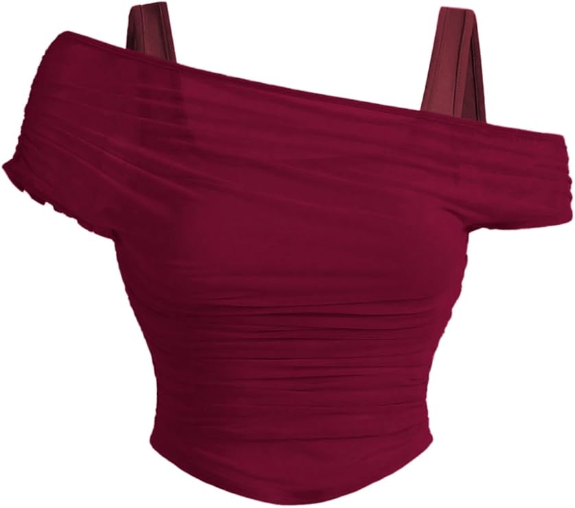 • WDIRARA Women’s Plus Size 2 in 1 Sheer Mesh Off Shoulder Tops Ruched Asymmetrical Short Sleeve Tee Shirt Red Plus