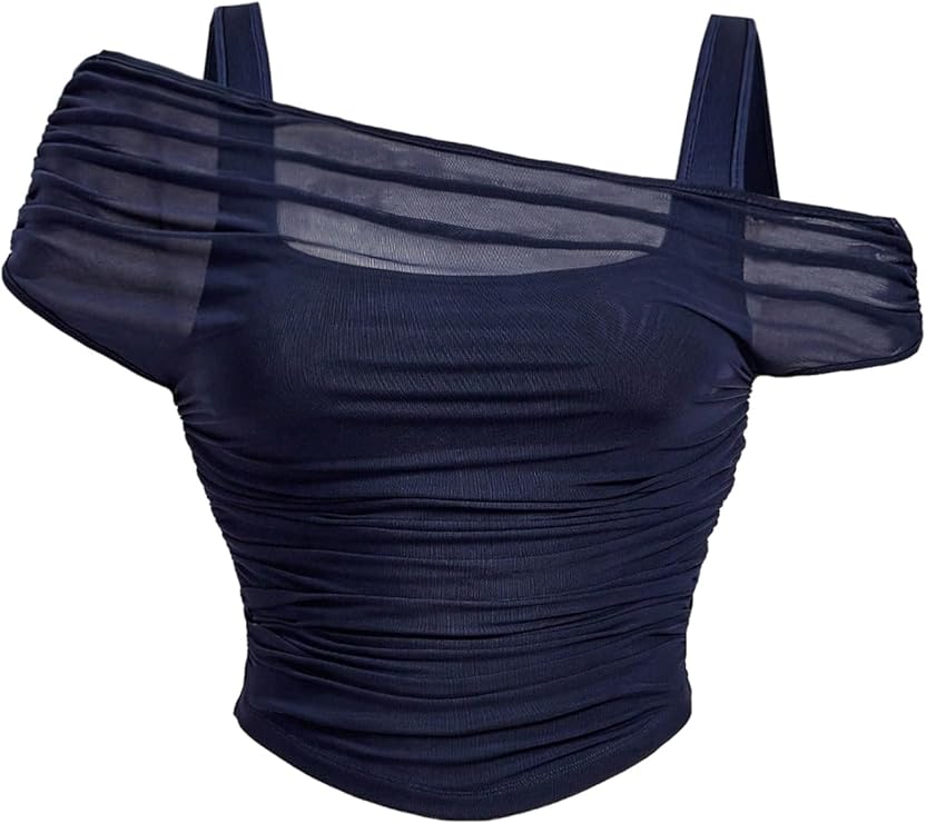 • WDIRARA Women’s Plus Size 2 in 1 Sheer Mesh Off Shoulder Tops Ruched Asymmetrical Short Sleeve Tee Shirt Deep Blue