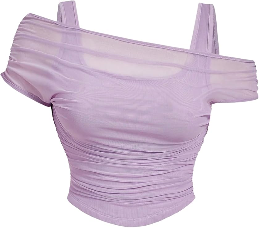 • WDIRARA Women’s Plus Size 2 in 1 Sheer Mesh Off Shoulder Tops Ruched Asymmetrical Short Sleeve Tee Shirt Lilac Purple
