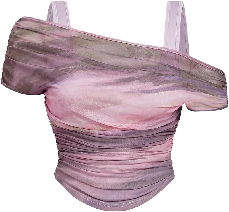 • WDIRARA Women’s Plus Size 2 in 1 Sheer Mesh Off Shoulder Tops Ruched Asymmetrical Short Sleeve Tee Shirt Purple Pink