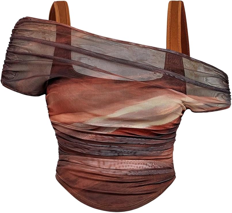 • WDIRARA Women’s Plus Size 2 in 1 Sheer Mesh Off Shoulder Tops Ruched Asymmetrical Short Sleeve Tee Shirt Light Brown