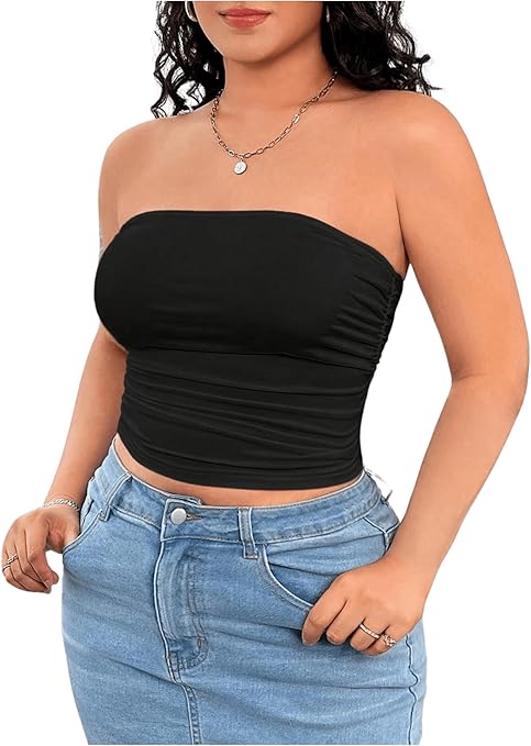 WDIRARA Women’s Plus Size Strapless Ruched Crop Tube Tops Summer Slim Fit Sleeveless Bandeau Top