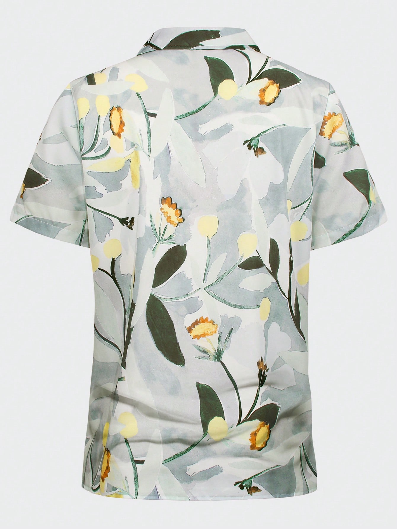 Button Up Short Sleeve Cat Print Beachwear Striped Pocket Hawaiian Shirt Casual Collar Top Floral Pearl