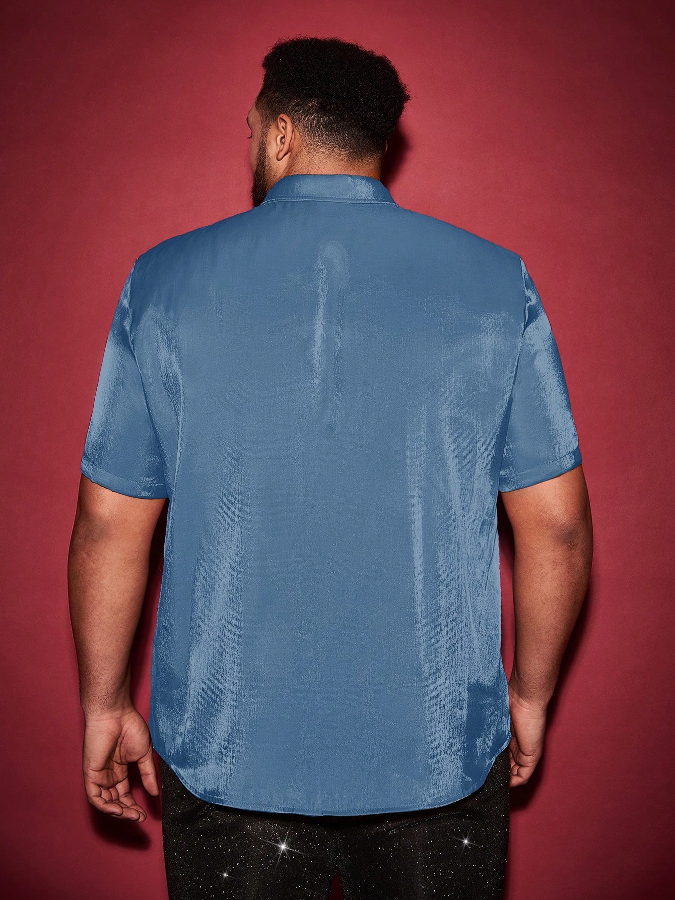 Silk Satin Metallic Button Down Short Sleeve Collared Shirts Rave Disco Club Tops Blue