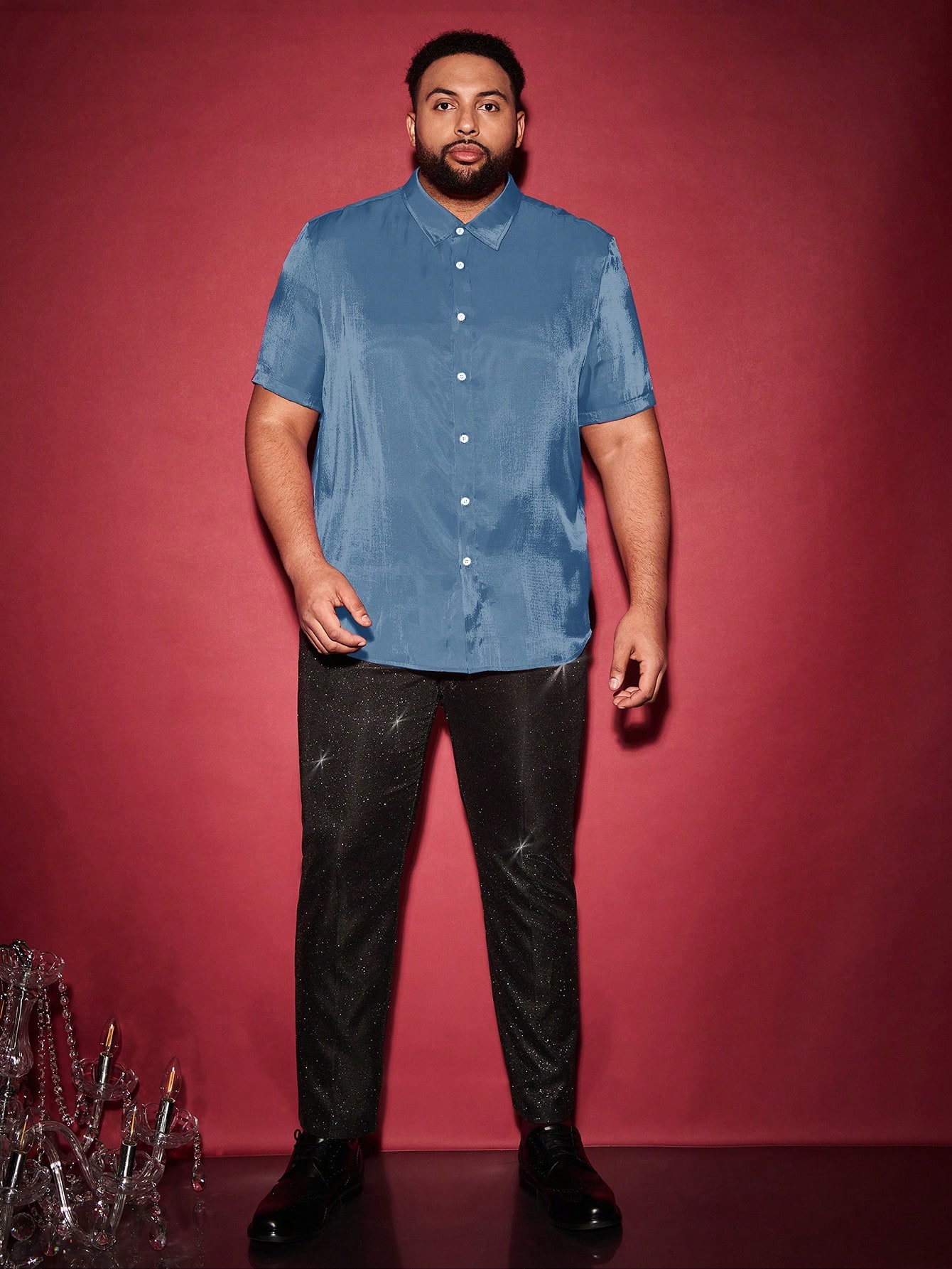WDIRARA Men’s Silk Satin Metallic Button Down Short Sleeve Collared Shirts Rave Disco Club Tops Blue Glitter
