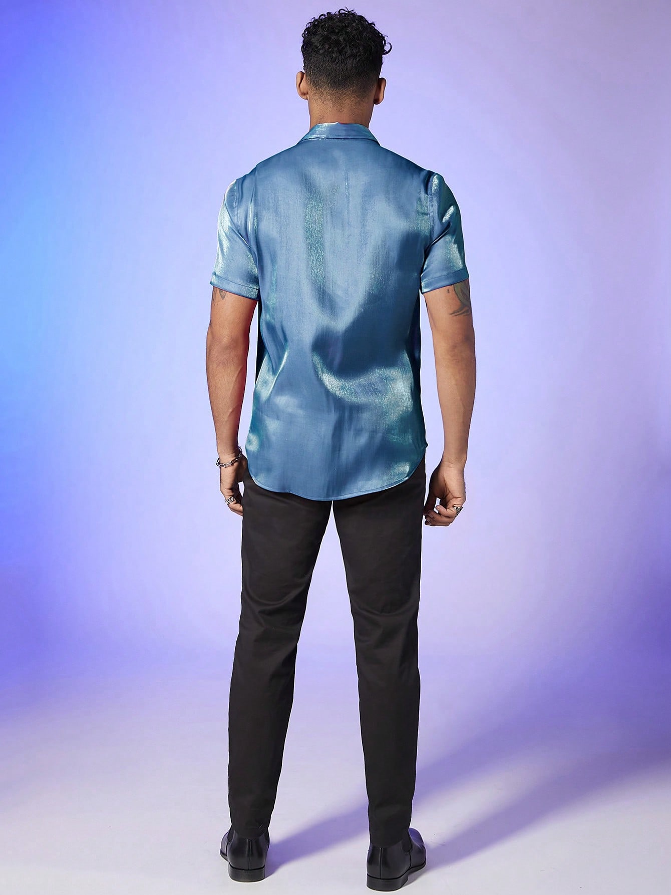 Silk Satin Metallic Button Down Short Sleeve Collared Shirts Rave Disco Club Tops Blue