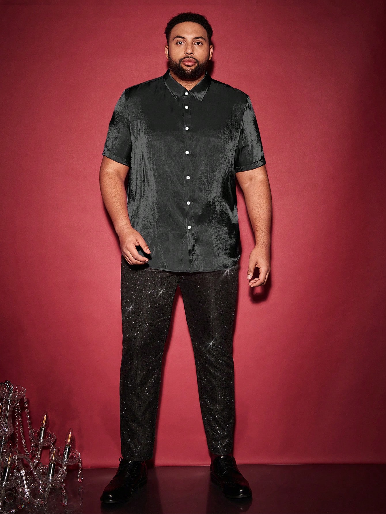 WDIRARA Men’s Silk Satin Metallic Button Down Short Sleeve Collared Shirts Rave Disco Club Tops Grey