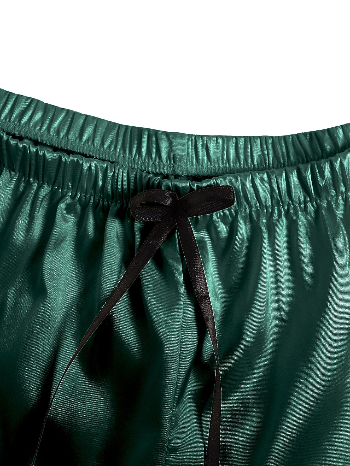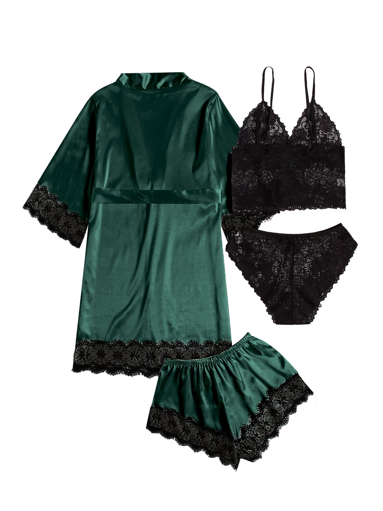 Silk Satin Pajamas Set 4pcs Lingerie Floral Lace Cami Sleepwear with Robe Dark Green
