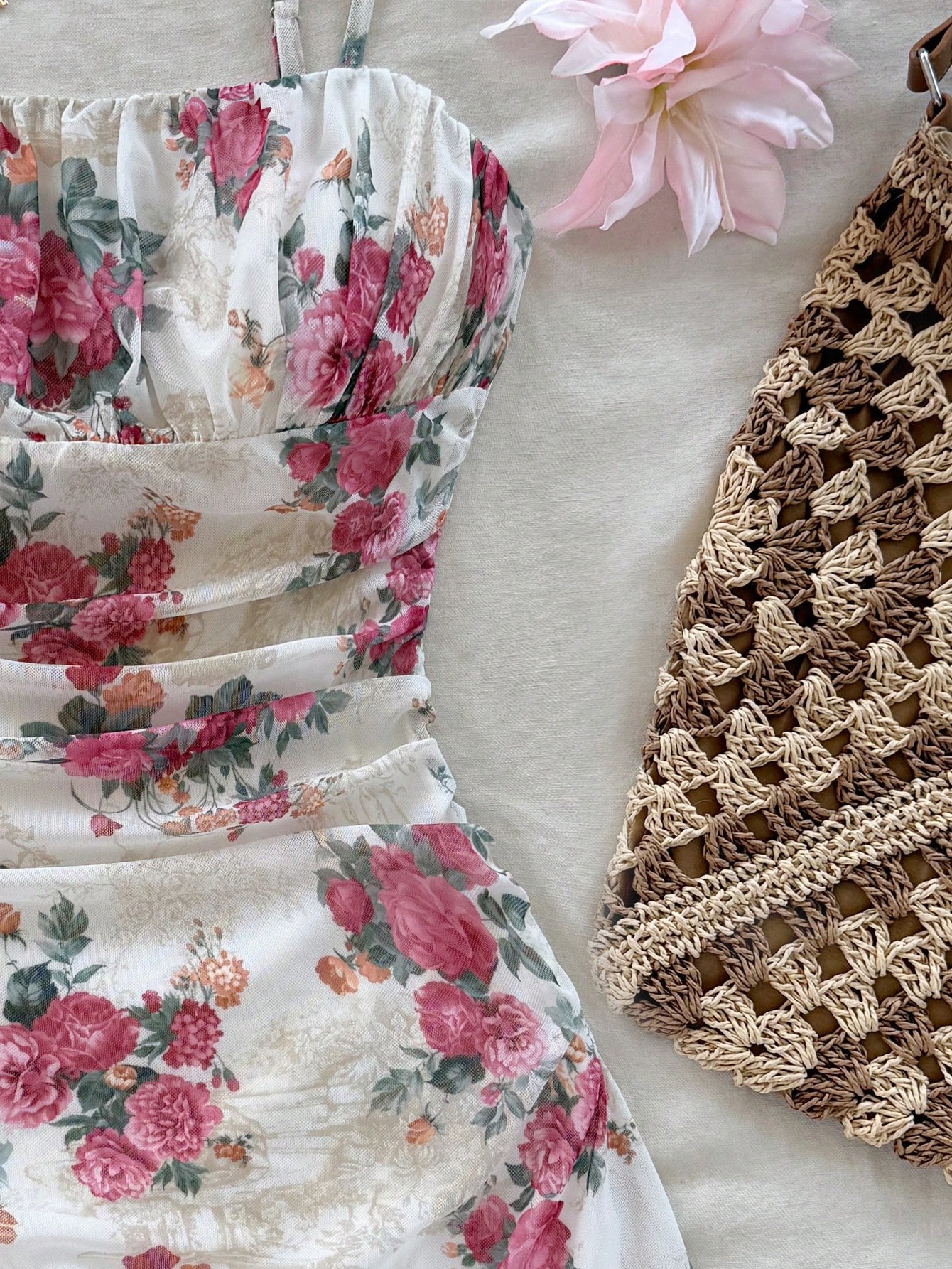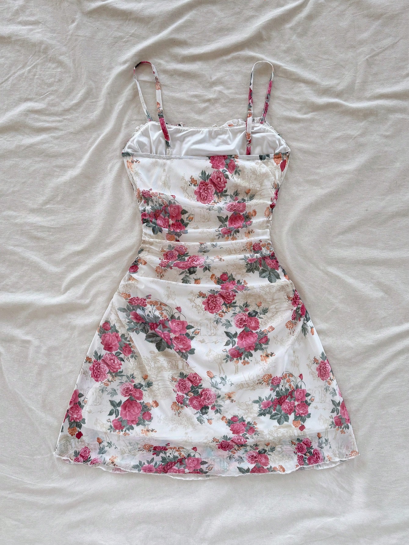 Floral Print Ruched Cami Dress Spaghetti Strap Ruffle Hem Mesh Mini Dress