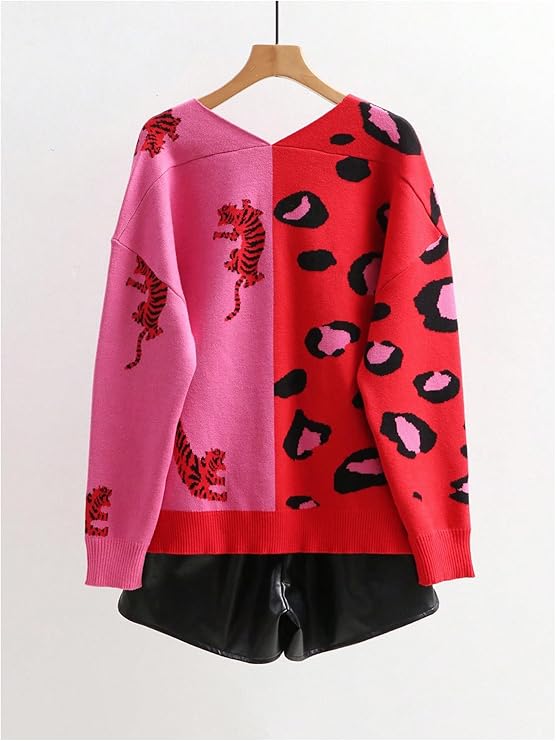 WDIRARA Women’s Leopard Tiger Print Cardigan V Neck Long Sleeve Color Block Button Down Sweater Outwear Rose Red