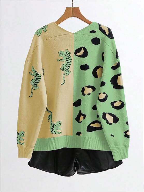 WDIRARA Women’s Leopard Tiger Print Cardigan V Neck Long Sleeve Color Block Button Down Sweater Outwear Yellow and Green