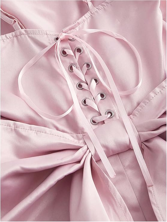 Features: sleeveless cami dress, features with lace up tie back, big bow, spaghetti strap, ruffle hem
