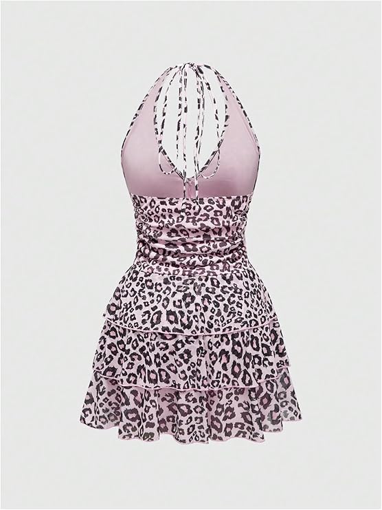 WDIRARA Women’s Y2k Leopard Print Halter Dress Tie Backless Layered Ruffle Hem Mini Dresses Cheetah Mesh Dress